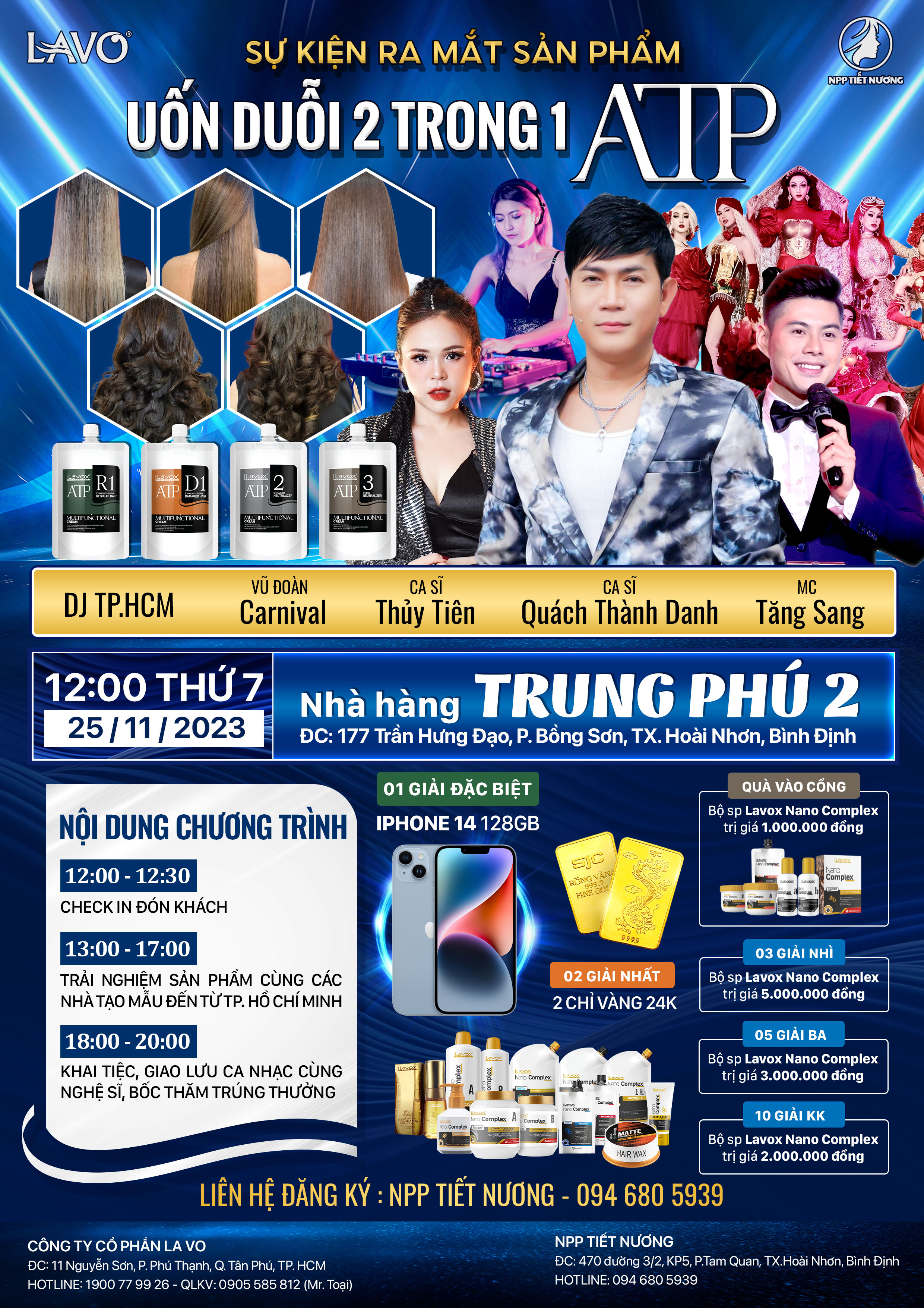 👉 Ngày 25/11/2023, Công ty CP LA VO sẽ chính thức giới thiệu đến các salon trên địa bàn tỉnh Bình Định sản phẩm Kem uốn duỗi thông minh 2 trong 1 ATP.