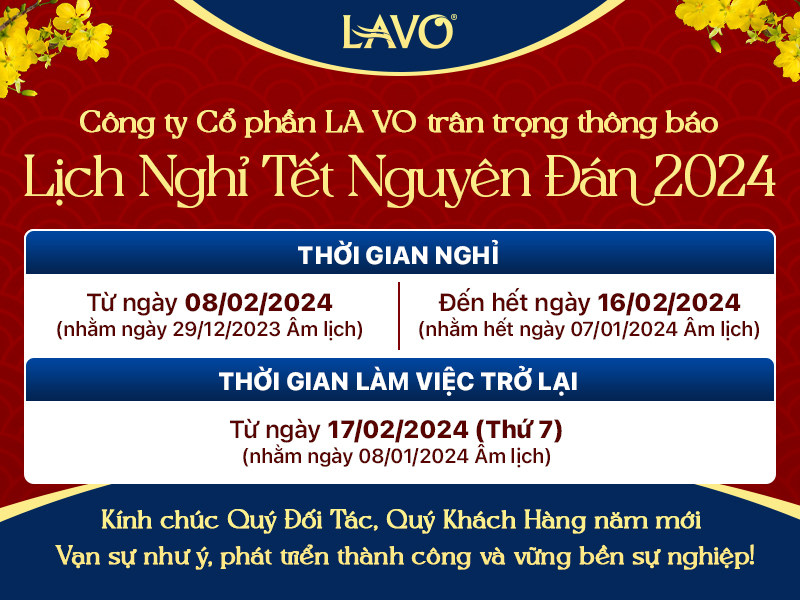 Công ty Cổ phần LA VO trân trọng thông báo đến Quý đối tác, Quý khách hàng 𝐋𝐢̣𝐜𝐡 𝐧𝐠𝐡𝐢̉ 𝐓𝐞̂́𝐭 𝐍𝐠𝐮𝐲𝐞̂𝐧 Đ𝐚́𝐧 𝐆𝐢𝐚́𝐩 𝐓𝐡𝐢̀𝐧 𝟐𝟎𝟐𝟒: