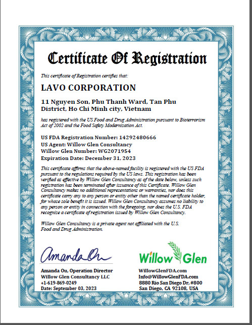 Mới đây, Công ty Cổ phần LA VO đã được Cục Quản lý Thực phẩm và Dược phẩm Hoa Kỳ cấp chứng nhận FDA. Đây là kết quả sau một thời gian dài doanh nghiệp từng bước hoàn thiện quy trình sản xuất và các tiêu chuẩn chất lượng quốc tế.
