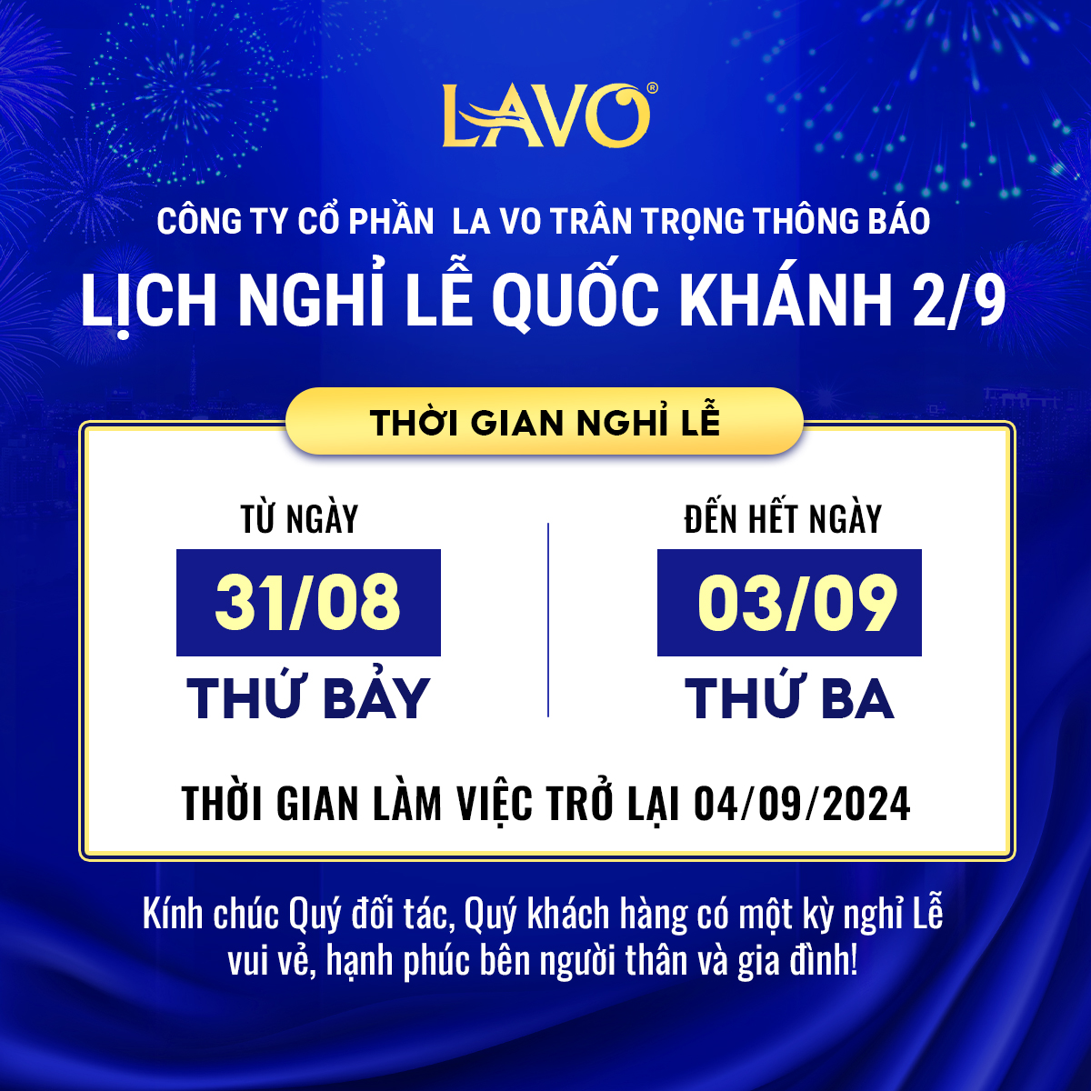 Nhân dịp kỷ niệm Ngày Quốc Khánh Việt Nam 2/9/2024, Công ty Cổ phần LA VO xin trân trọng thông báo đến Quý khách hàng, Quý đối tác về lịch nghỉ lễ như sau: