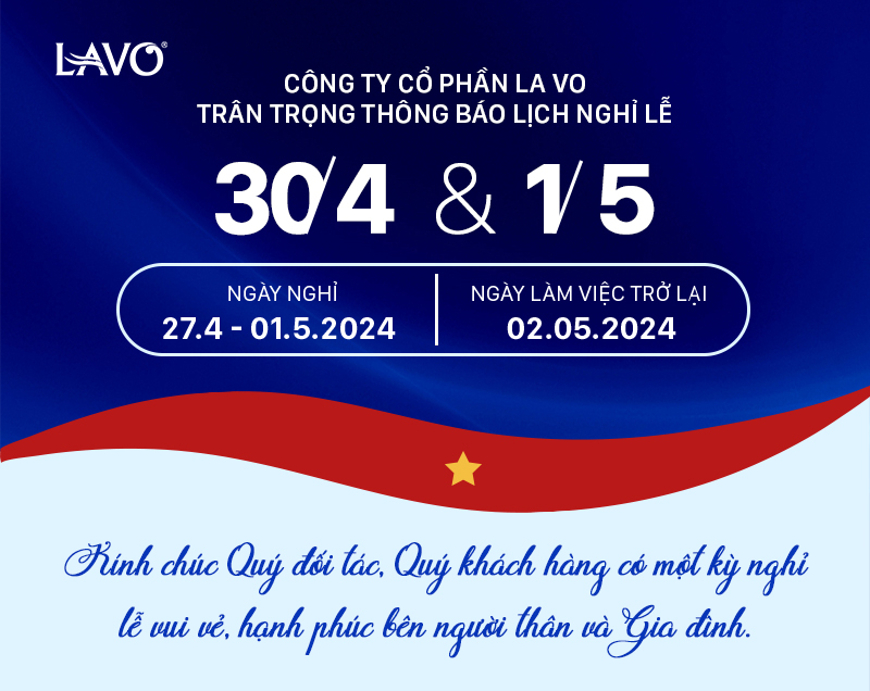 Công ty Cổ phần LA VO trân trọng thông báo đến Quý đối tác, Quý khách hàng 𝐋𝐢̣𝐜𝐡 𝐍𝐠𝐡𝐢̉ 𝐋𝐞̂̃ Giải phóng miền Nam – thống nhất đất nước 30/4 & Quốc tế Lao động 01/5/2024 như sau:
