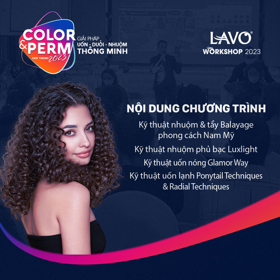 Với mong muốn chia sẻ đến các Salon những kỹ thuật, xu hướng làm tóc mới nhất hiện nay, đồng thời tạo cơ hội để gặp gỡ, giao lưu, trao đổi kinh nghiệm giữa những đồng nghiệp trong ngành tóc, Công ty Cổ phần LA VO đã phối hợp với các Nhà phân phối tổ chức chuỗi chương trình Workshop với chủ đề “Color & Perm – Hot Trend 2023 – Giải pháp Uốn – Duỗi – Nhuộm Thông Minh” sẽ chính thức diễn ra từ ngày 22.5.2023 – 26.5.2023.